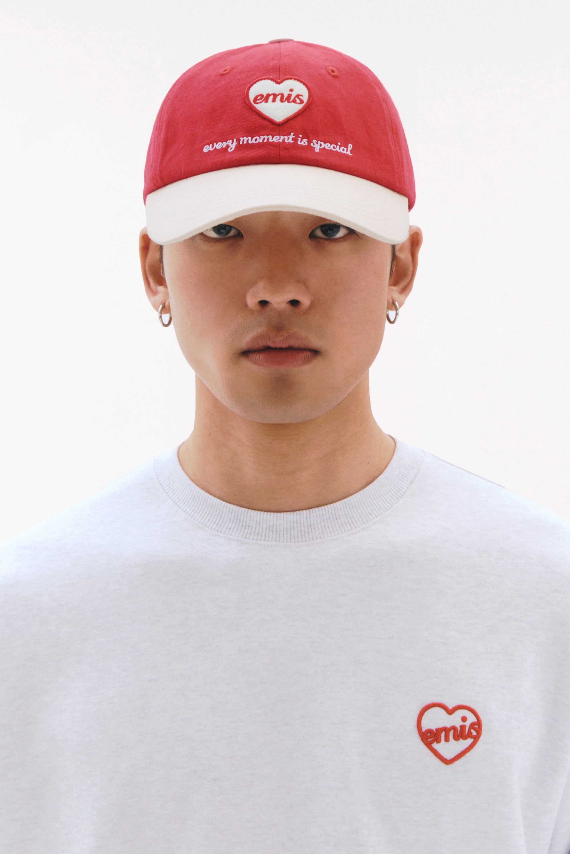 HEART WAPPEN TONE ON TONE BALL CAP 同色系設計搭配愛心布章與Emis Logo刺繡,展現低調細節美感。